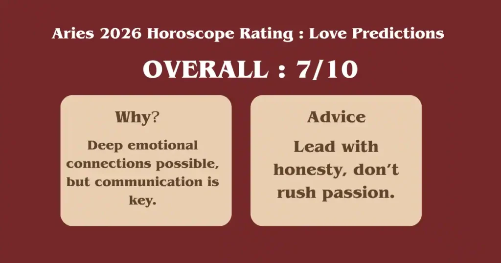 - If you’ve been in quick-fling territory, the Love Predictions for Aries 2026 Horoscope suggest shifting toward connections that ask for sincerity, openness and stability.