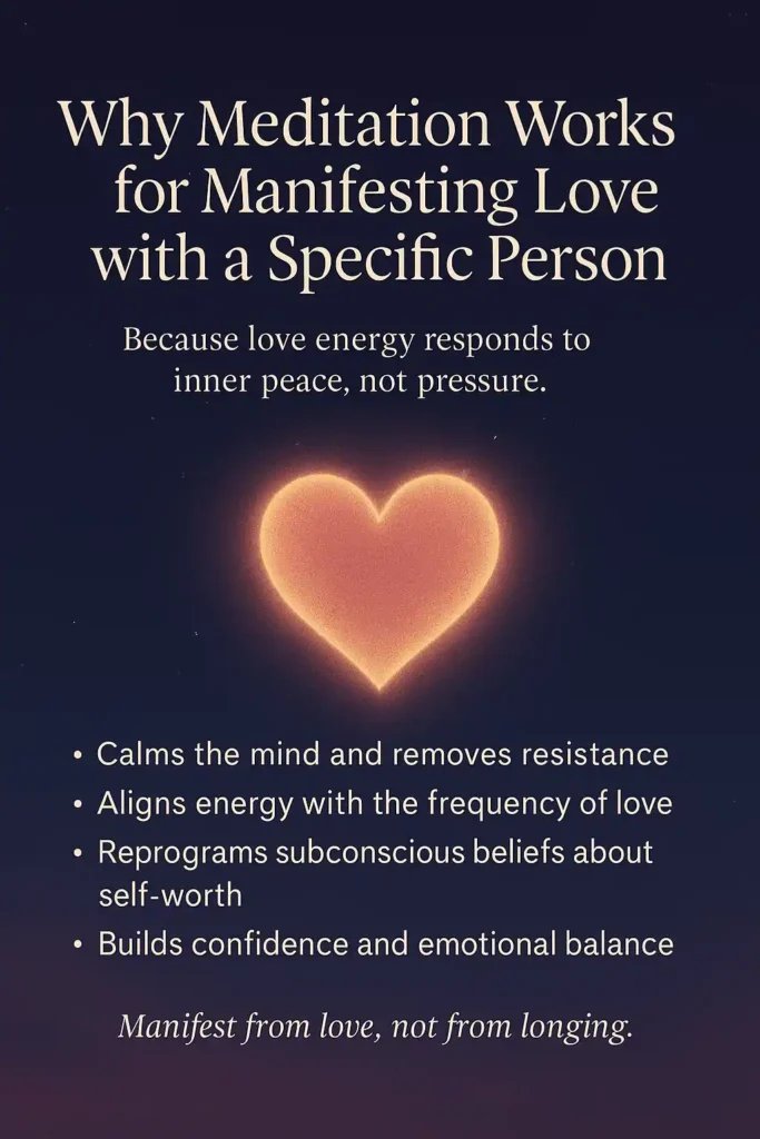 Here’s the truth, meditation isn’t just about sitting quietly. It’s a science of tuning your energy to what you want to receive. When you’re trying to manifest love with a specific person, your thoughts, emotions, and self-worth are the real foundation of what unfolds.