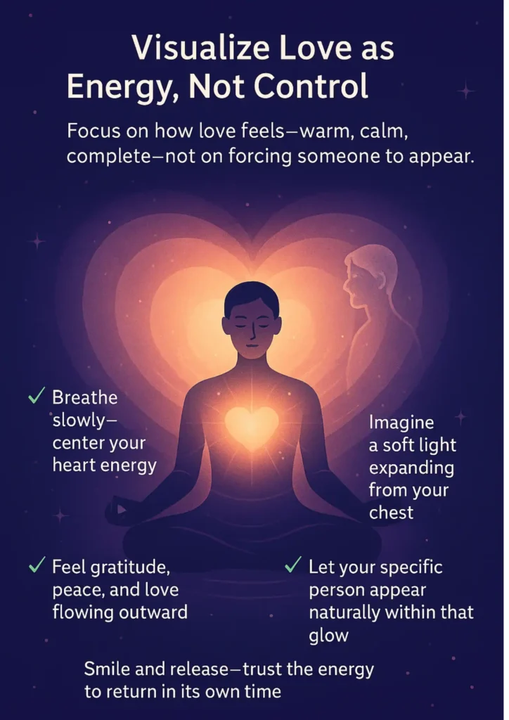 A specific person meditation works by shifting your focus from lack (“they’re not here yet”) to abundance (“I am already in love, I am already complete”). Through calm, intentional visualization, your mind begins to associate that person’s presence with feelings of peace and joy rather than need or anxiety. This subtle energetic shift makes a huge difference, because energy responds to emotion, not desperation.