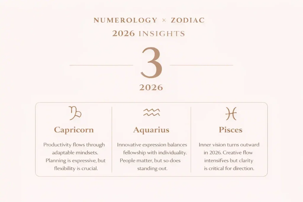 Capricorn and Number 3 approach life from opposite ends. Capricorn values structure, responsibility, and long-term effort, while Number 3 brings expression, creativity, and flexibility. Within number 3 numerology 2026 predictions horoscope, this creates a year where Capricorn is asked to soften rigidity without losing control.